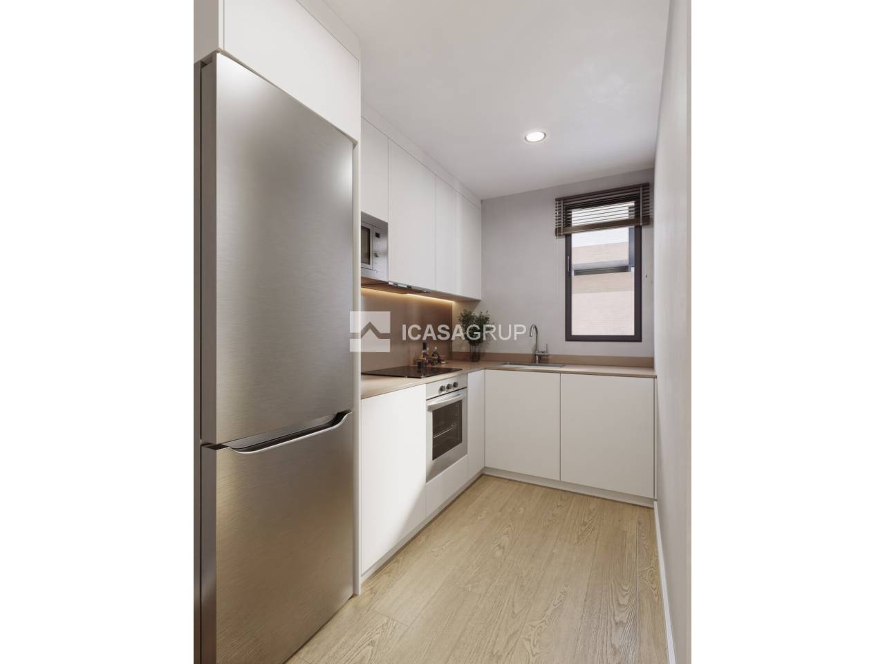 Con cocina americana totalmente equipada: placa de inducción, horno, microondas y grupo filtrante integrado.